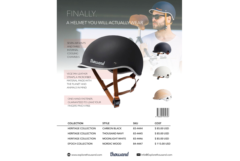 Print Design This is a sellsheet created for Thousand, a bicycle helmet company. Created with inDesign and Photoshop. The goal for this project was to include relevent product information, imagery, and a table without looking cluttered.
